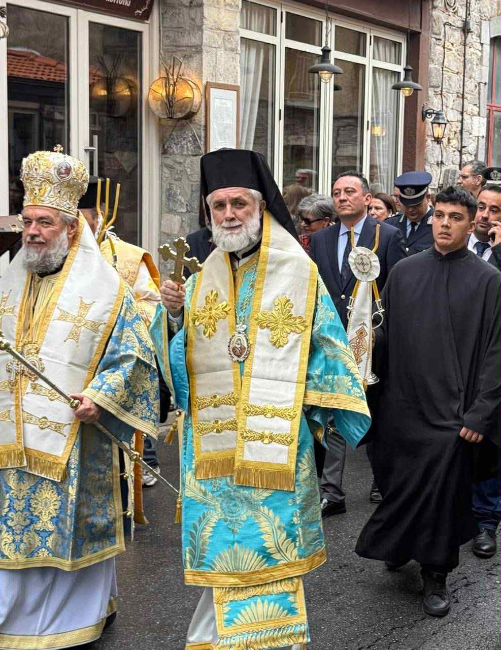 Ακολούθησε η ιερά λιτάνευση της Εικόνας, με τη συνοδεία στρατιωτικού αγήματος και της φιλαρμονικής, μέσα σε κλίμα κατάνυξης και ευλάβειας. Την Ιερά Εικόνα συνόδευσαν ο Σύλλογος Γυναικών Λαγκαδίων «ΤΡΙΣΕΥΓΕΝΗ» και νέοι με παραδοσιακές φορεσιές, προσδίδοντας ιδιαίτερη λαμπρότητα και χρώμα στην τελετή.